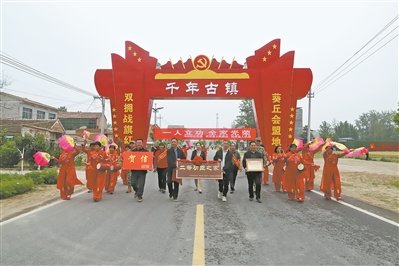 “正月里来是新春,赶上了猪羊出呀了门,猪啊羊啊送到哪里去,送给咱英勇的八路军……”5月25日,伴随着欢快的《拥军秧歌》声,河南省民权县军民为二等功臣家庭送喜报,从千年古镇葵丘所在地林七乡经过时,引来道喜的乡亲们。
