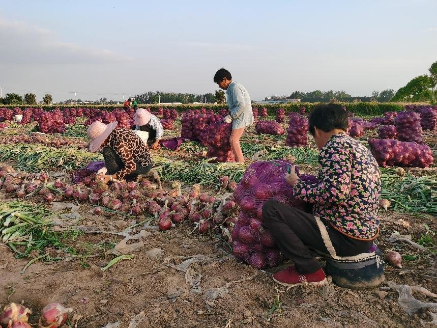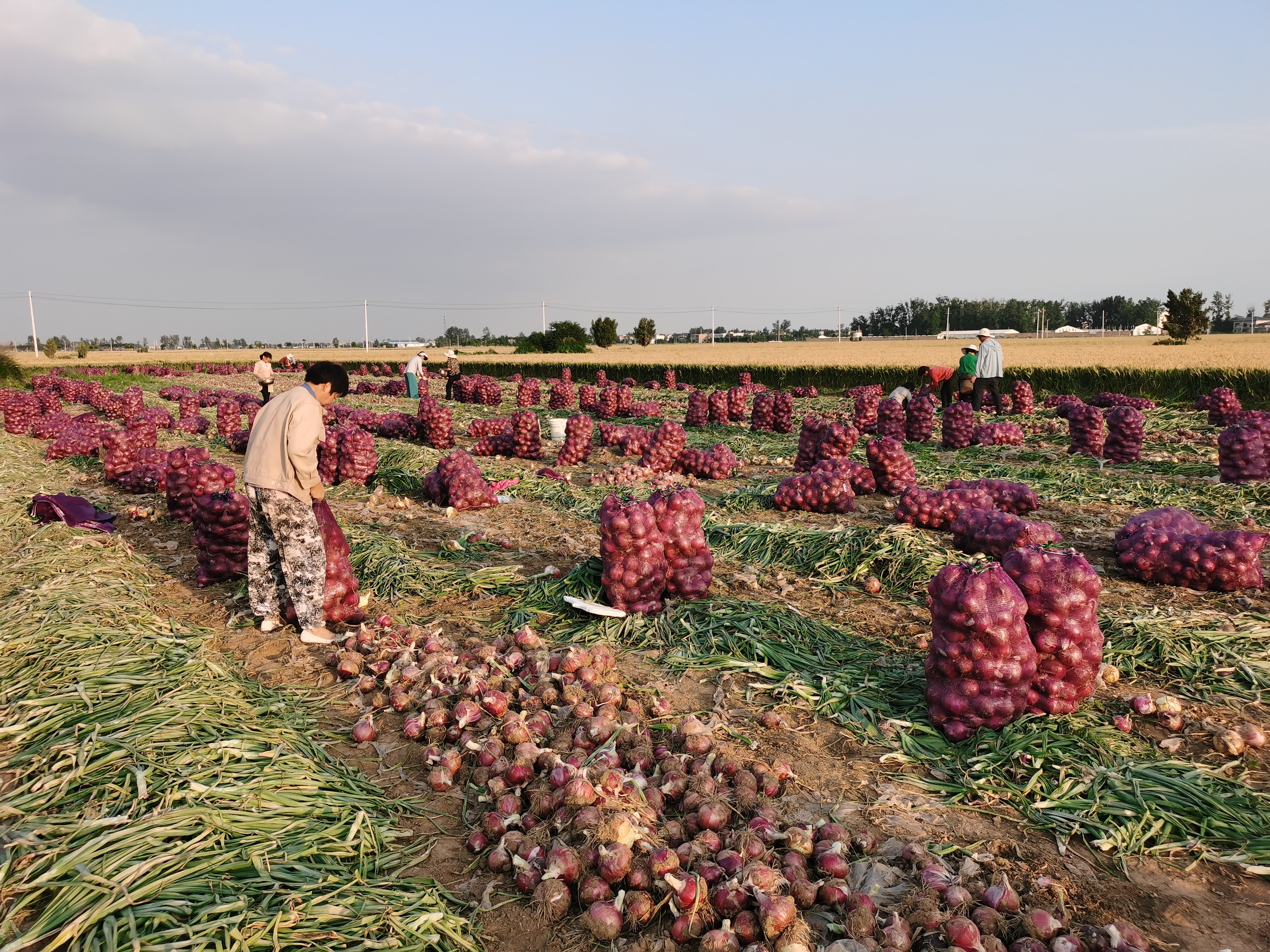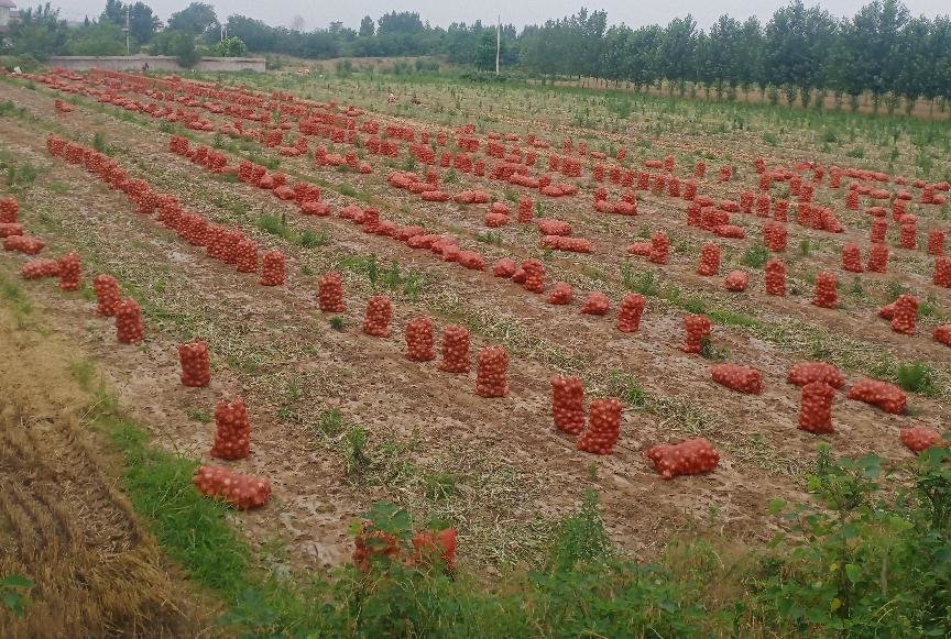 6月份以来,郏县薛店镇的红皮洋葱进入丰收季,在狮子口村、赵南村的200多亩洋葱地里,农户熟练地挖葱、剪叶、装袋,一袋袋带着泥土气息的新鲜洋葱被成排堆放在田地里,呈现出一幅丰收的画面。