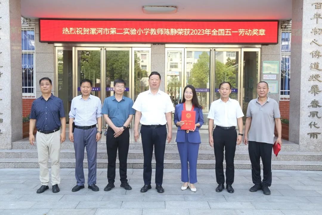 6月21日,市委教育工委委员、市教育局党组成员、副局长王耀宗来到漯河市第二实验小学,为陈静老师颁发全国五一劳动奖章和证书。
