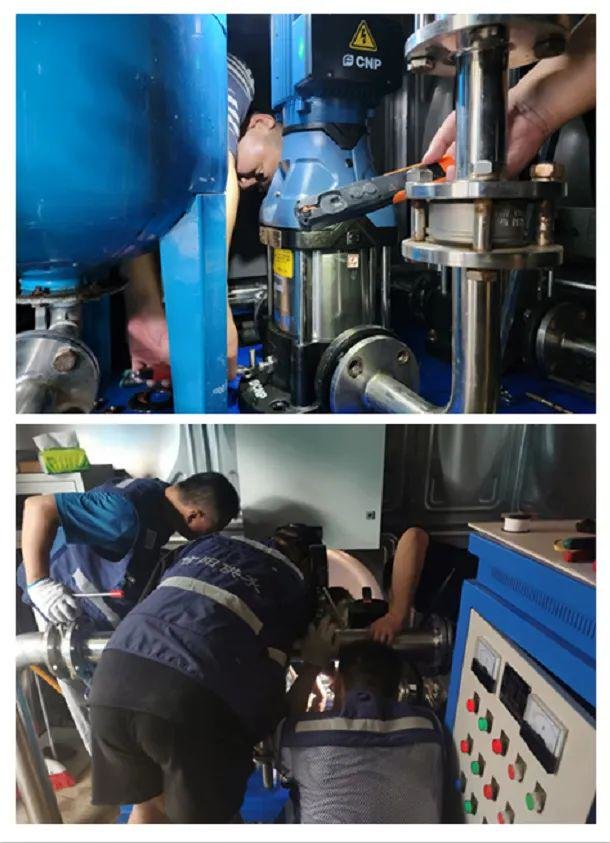 在华星小区,巡查人员发现泵房内水泵电机有明显异响发热,造成水压不稳。巡查人员克服泵房内空间狭小等不利因素,蜷缩身体展开作业,首先把低区控制柜断电,关闭进水总阀门,开封新泵并检查泵体后,拆卸闷板,放好阀门和垫片,随后安装立式多级离心泵。经过及时维修,设备正常运行,恢复正常供水。