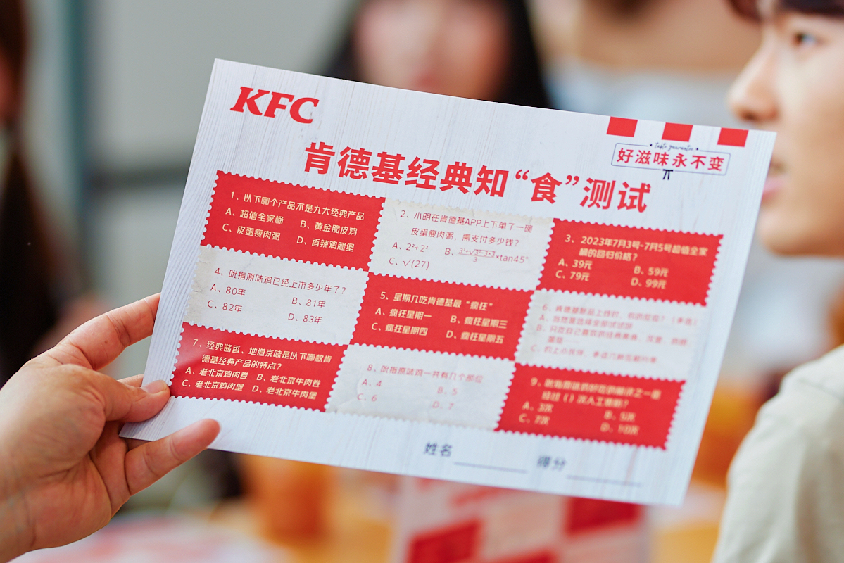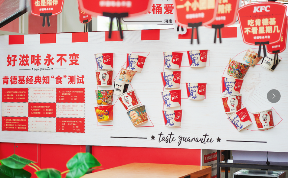 另外餐厅还有关于九大经典产品的知“食”问答,比如原味鸡上市的时间,经典产品好吃的秘密,回答对问题即可得到一张“纸质优惠券”,引发了一波消费者的“回忆杀”,每一款美味,都凝聚着一个个幸福“食刻”。
