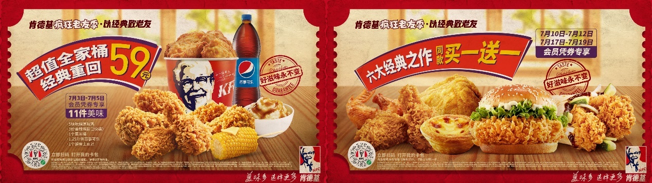 这个暑期肯德基疯狂老友季也再度回归,以经典好滋味致老友:2023.7.3-7.5超值全家桶会员凭券59元享,2023.7.10-7.12 & 2023.7.17-7.19 六大经典好滋味会员凭券专享同款买一送一(可选产品包含香辣鸡腿堡、老北京鸡肉卷、吮指原味鸡、葡式蛋挞、新奥尔良烤翅、香辣鸡翅)。