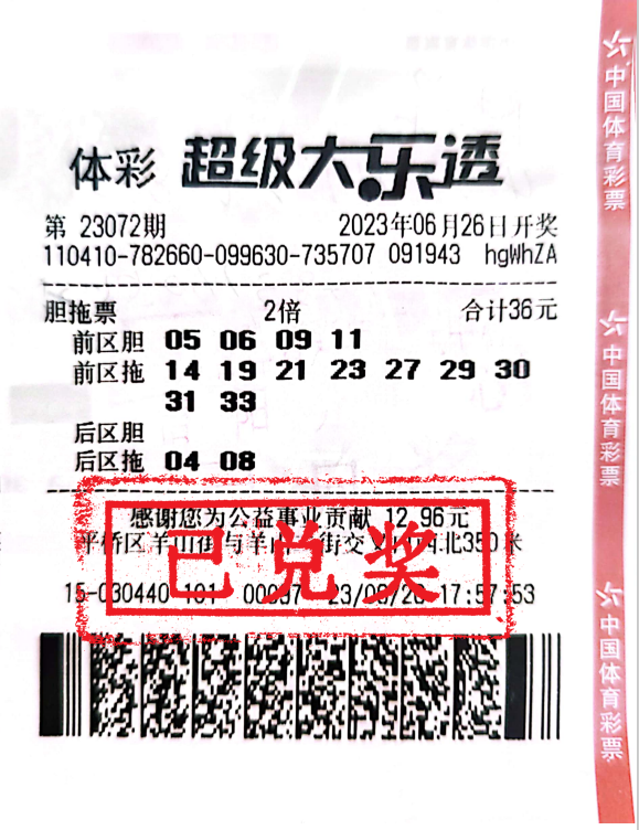 6月26日晚大乐透第23072期开奖,前区号码05、06、09、11 、14,后区02、04,来自河南信阳的购彩者凭借一张前区4胆9拖的2倍票,喜提大乐透二等奖!