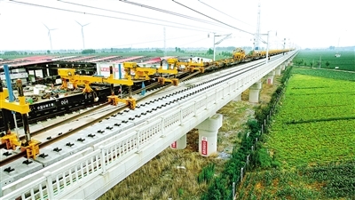 记者从中国铁路郑州局集团有限公司获悉,7月12日,随着最后一组500米长钢轨在清丰特大桥顺利铺设到位,济郑高铁濮阳至鲁豫省界段高速铁路正线铺轨全面贯通,为如期实现开通目标奠定了坚实基础。