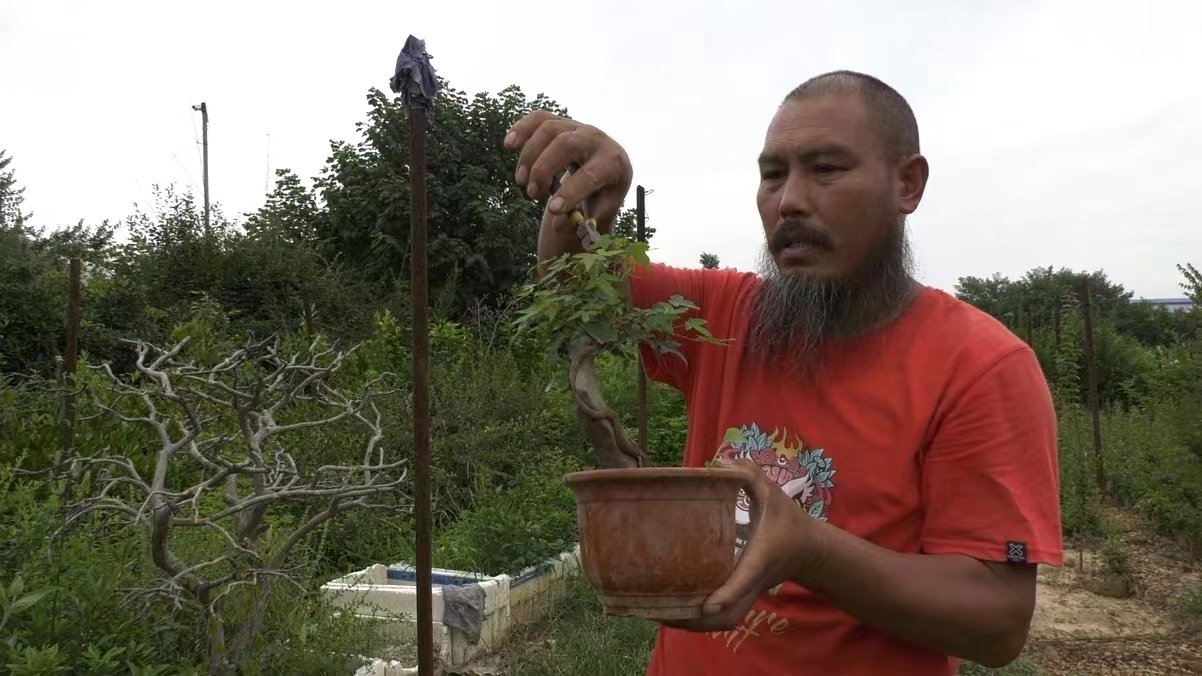 “这三角枫将来上盆了以后,它的叶子也就这么小,并且尖上是鲜红鲜红的,附在石头上有时来运转、鸿运当头的寓意,又象征着生意、生活红红火火。这基本上做都是半成品,人人都能欣赏,人人能玩。”郏县花涧园艺农场负责人高小五说。