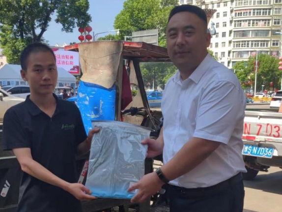 申信建材有限公司为淮干采砂王岗乡采砂场项目工作人员、安保和保洁人员送去藿香正气水、毛巾、饮料等防暑降温物资。