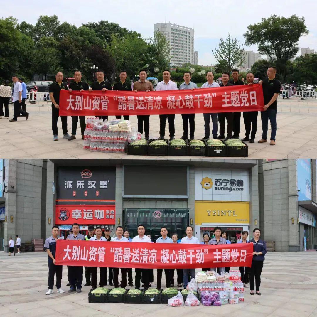 大别山资管党支部为润信汽车租赁有限公司司勤人员、信誉物业安保和保洁人员送去西瓜、藿香正气水、矿泉水等防暑降温物资。