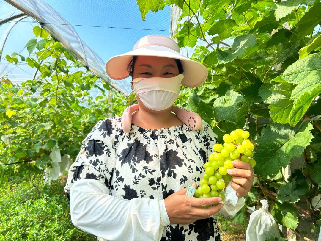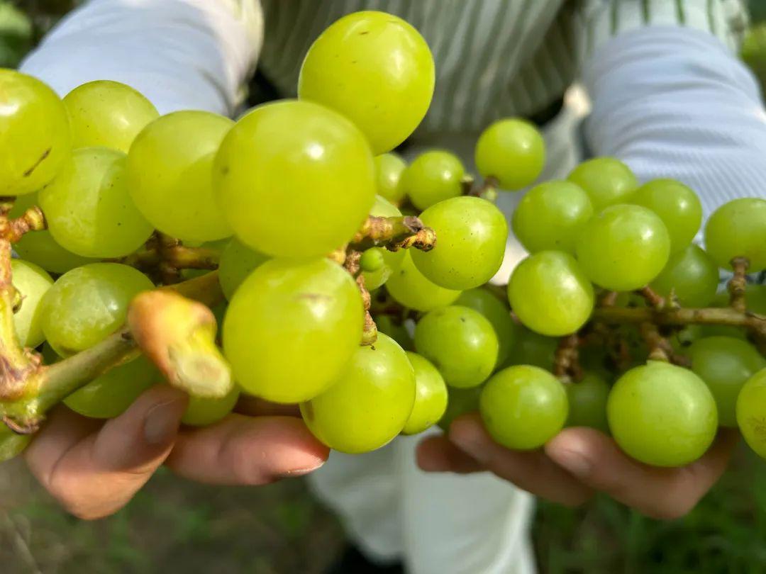 撕开外面的袋子,一个个“绿精灵”纷纷探出脑袋。信阳市神农山庄经理陈红说:“在套完袋后大概二十天,葡萄就基本成熟了。这种果粒呈黄绿色的葡萄叫‘阳光玫瑰',它的果肉细腻柔软,口感爽脆多汁,甜度高,还带着淡淡的玫瑰香味,很多人喜欢吃这个品种。”