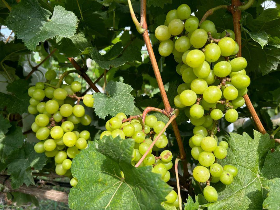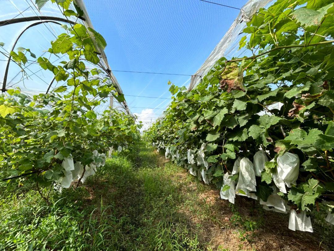 8月3日,走进葡萄园,长长的葡萄走廊映入眼帘。一串串裹着白色外衣的葡萄在阳光的照耀下格外显眼,套袋葡萄长势喜人、丰收在望。