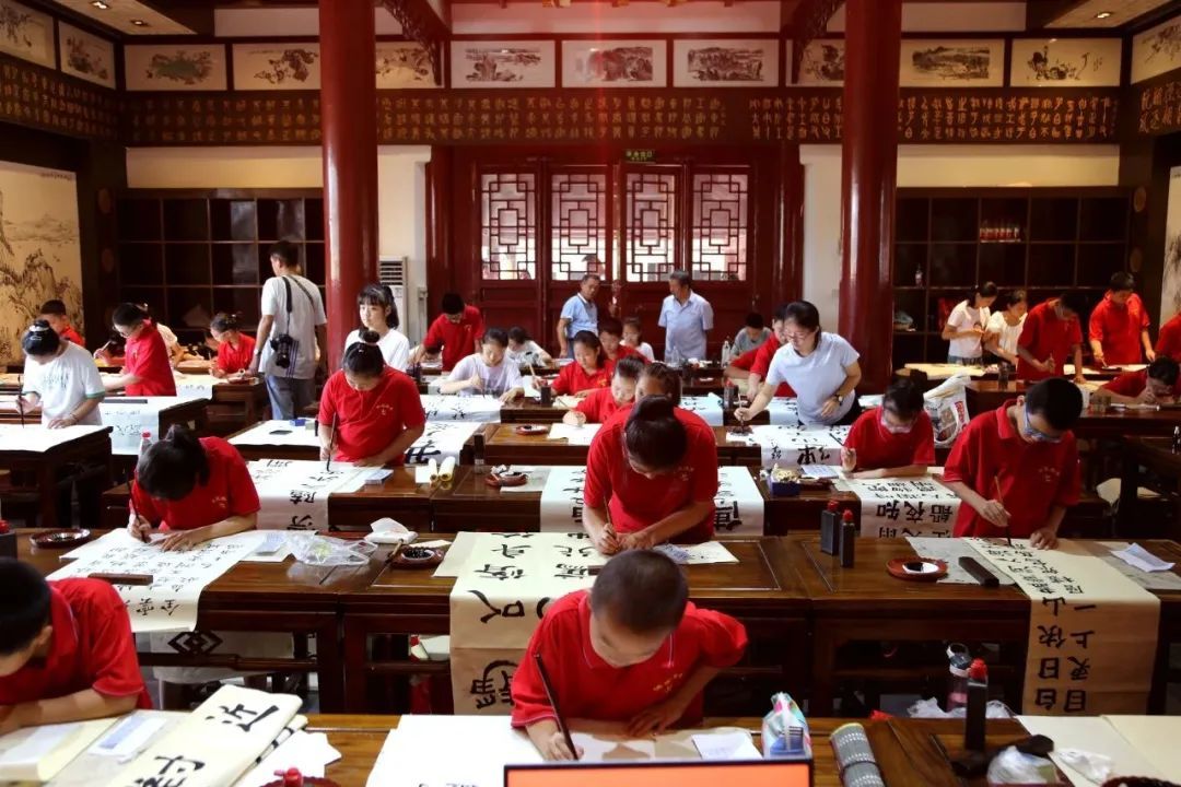 当天下午,“翰园杯”国际青少年书画大展赛总决赛在翰园碑林北大殿举行,青少年参赛者们现场挥毫泼墨,角逐第一。书写长卷现场笔墨飘香,洋溢着文雅之风。