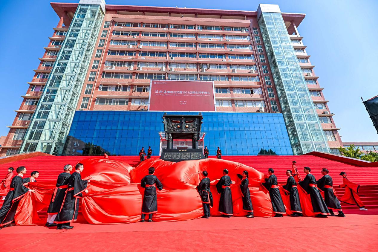 “西襟函谷,东枕神都。绾依丝路,蟠踞名区。结楼阁于神阙,嵌胶黉之明珠……”“洛科卅五,吉金天呈,兹仿周制,安鼎勒铭……”9月3日,洛阳科技职业学院14000名师生身着汉服,齐颂洛科赋、洛科鼎铭,“洛科鼎”正式揭牌落成。