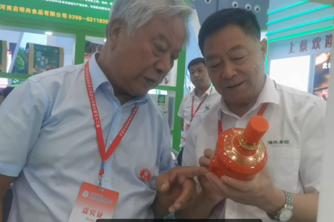 集团总经理王清华在西平展区展位向河南农业大学教授、博士生导师郭天财介绍豫坡酒业老王坡生态原粮基地及产品和之基H6