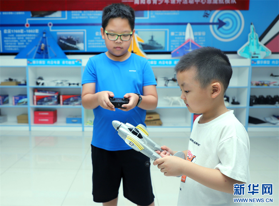 9月17日,在河南省南阳市科学技术馆,小朋友在航空航天科普课堂上体验飞机飞行。