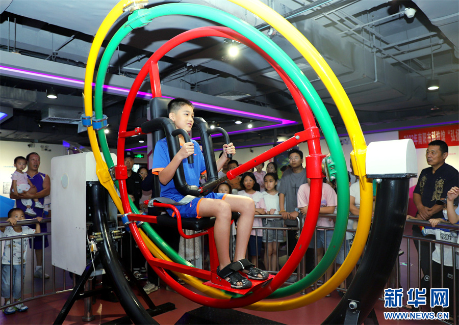9月17日,在河南省南阳市科学技术馆,市民在体验三维滚环。