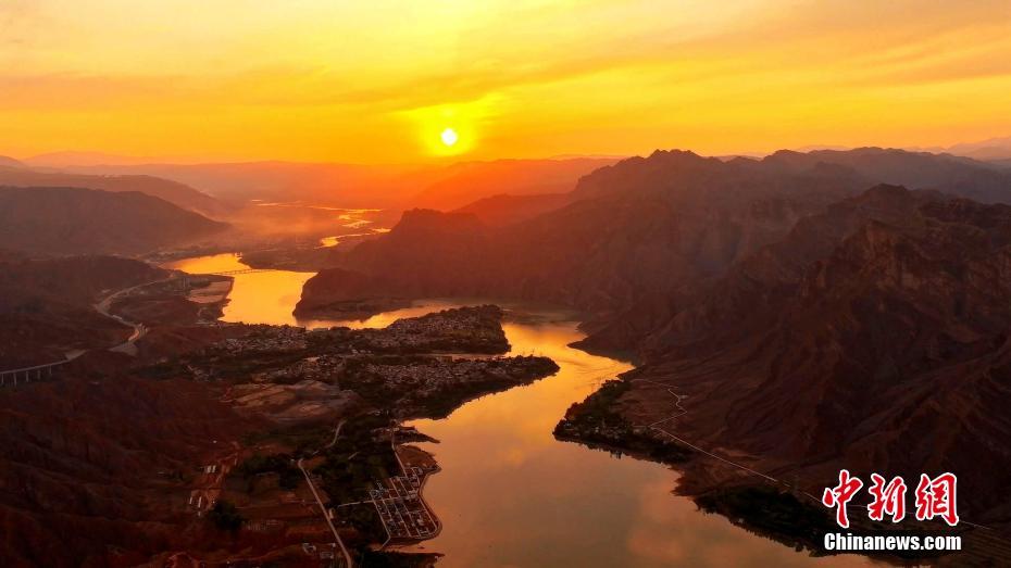 高原秋日,在位于黄河上游的青海省海东市循化撒拉族自治县,摄影师用航拍镜头记录下黄河蜿蜒穿城而过。图为夕阳下的黄河及沿岸风景。