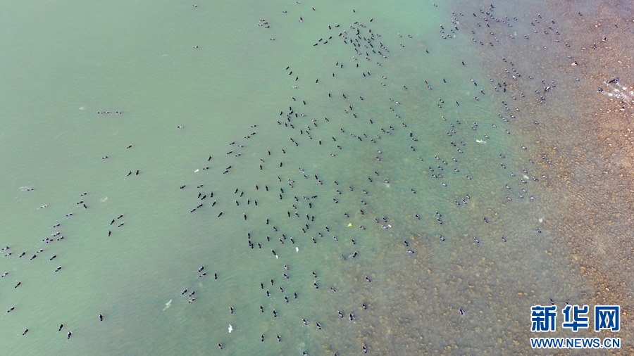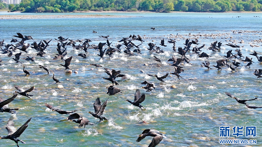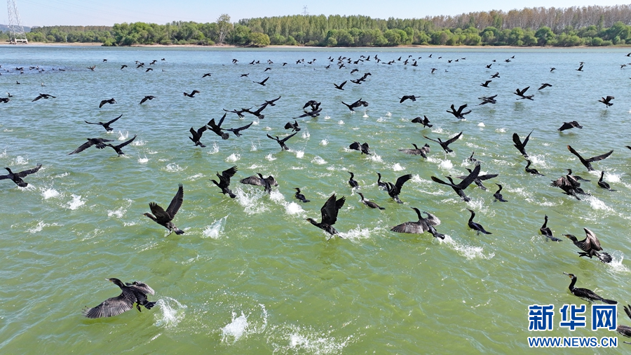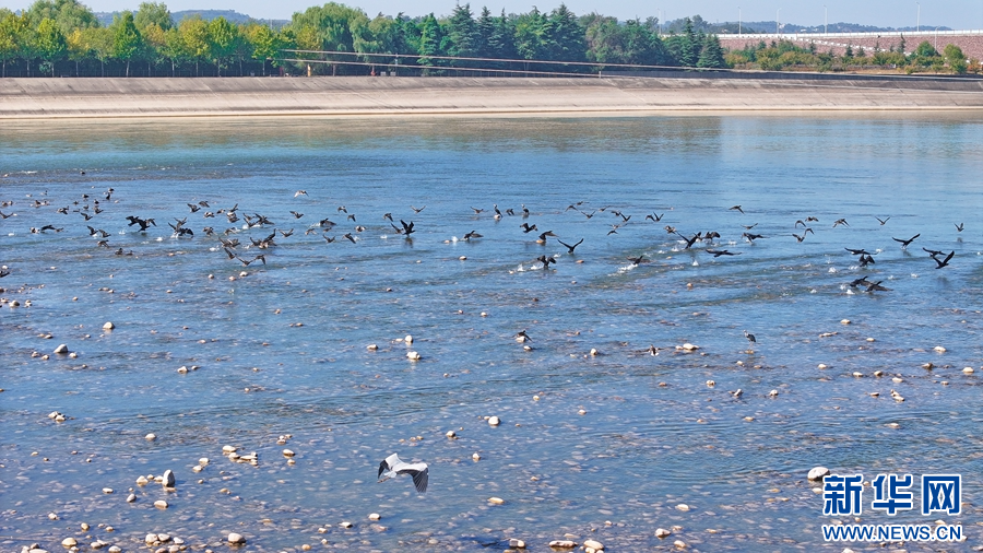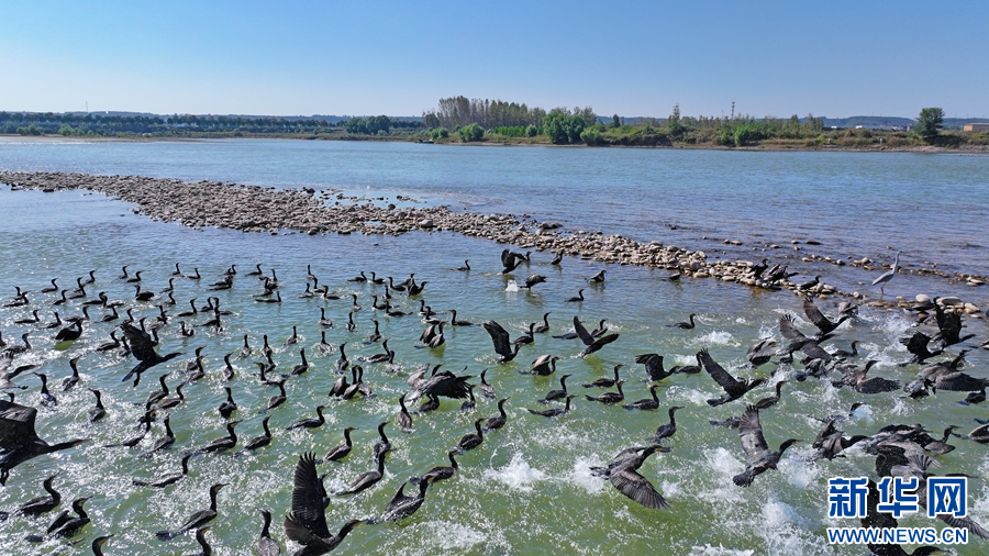 10月16日,在洛阳市孟津国家级黄河湿地自然保护区的夹心滩、浅水滩等水域,成千上万只普通鸬鹚、斑嘴鸭、白鹭在空中飞翔,不时传来阵阵鸟鸣声,构成了一幅人与自然和谐共生的美好画卷。新华网发(马绍磊 郑占波 摄)