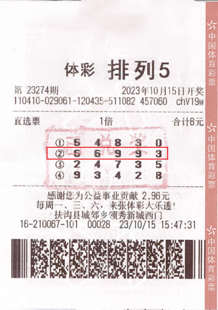据了解,中奖者张先生(化名)是一位资深购彩者,闲暇之余就会到附近的体彩实体店购买几注彩票,体彩玩法中比较偏爱“排列5”玩法。15日下午,张先生来到位于领秀新城西门的体彩实体店,根据以往的选号方式选了4注单式号码,没想到能收获10万奖金。