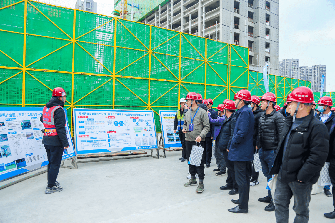 最后,与会代表观摩了郑州天健湖智联网产业园(南区)项目,项目管理人员向与会嘉宾介绍了该项目科技创新经验和做法,为参会人员在施工过程中完善质量标准化管理、实现智慧化建造提供了借鉴和参考。中建八局天健湖智联网产业园(南区)项目二期总建筑面积22.3万平方米,建成后将发展形成省级、区域级乃至国家级智算中心,成为“东数西算”的“郑州应用样板”。