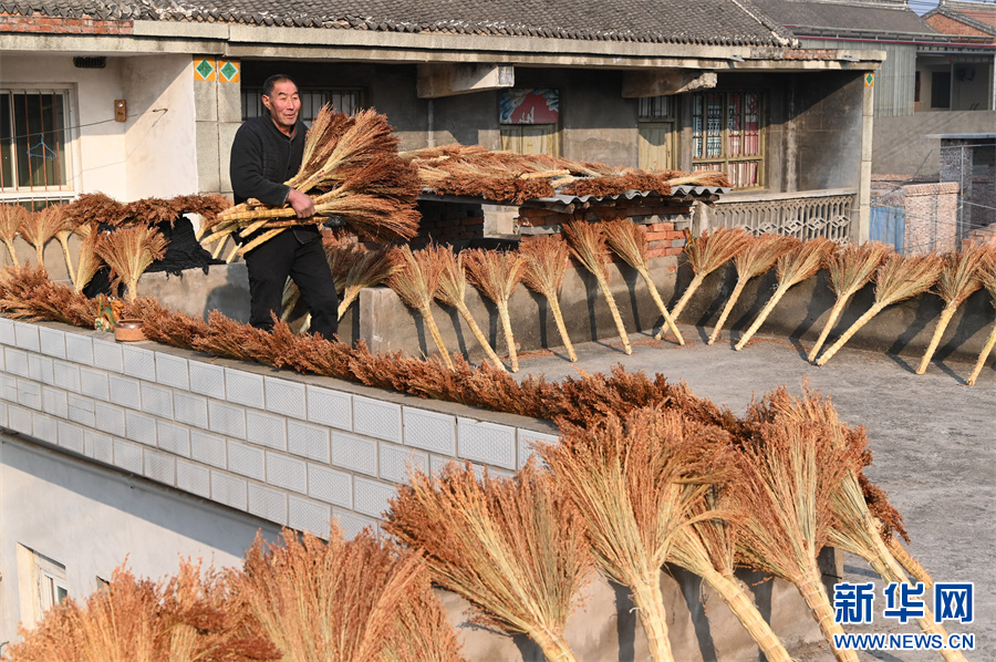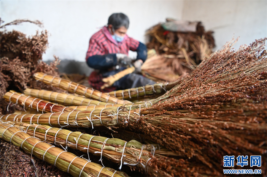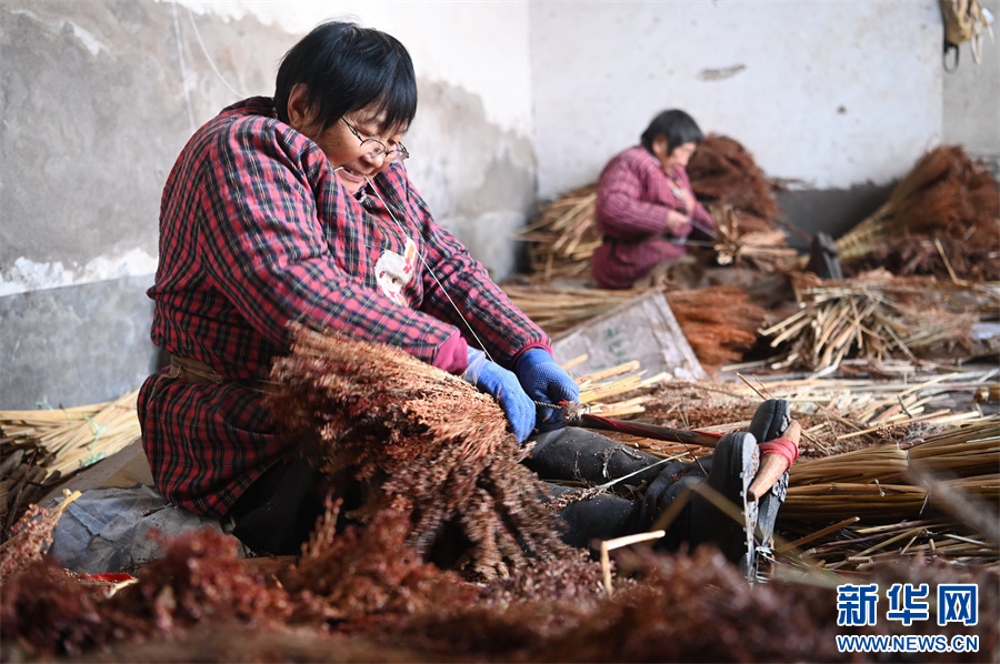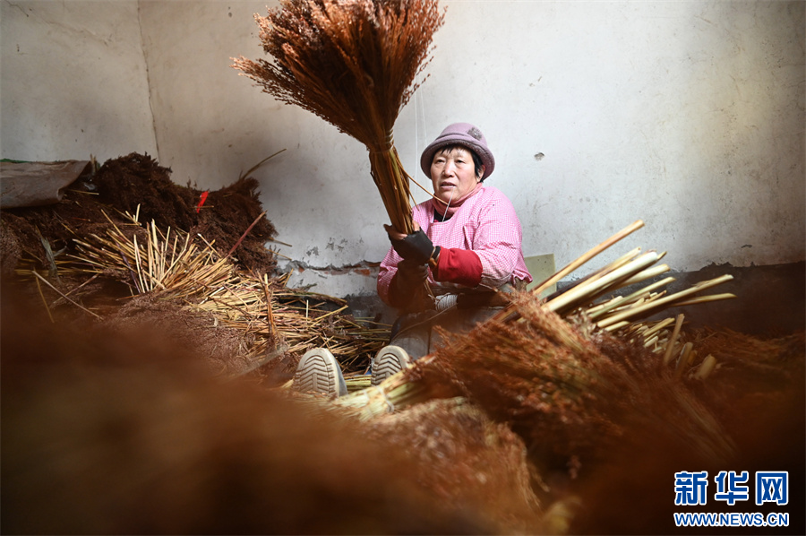 近年来,河南省沁阳市柏香镇广韩村将生产笤帚作为增加农民收入、助力乡村振兴的特色产业,引导制作笤帚能手成立了5家笤帚加工专业合作社,采用“合作社+农户”形式,带动村里的百余人扎笤帚和销售笤帚。新华网发(杨帆 原钰恒 摄)