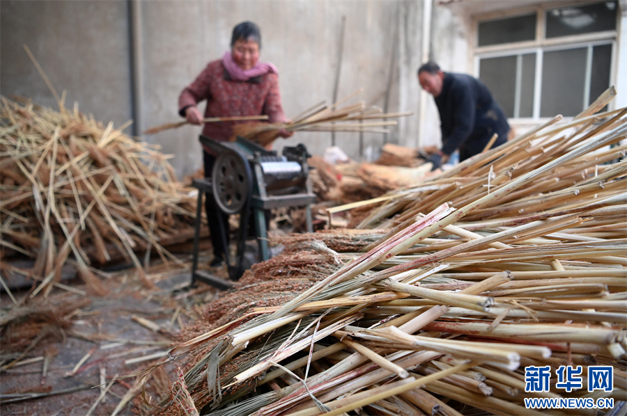 1月10日,河南省沁阳市柏香镇广韩村聂中长笤帚加工零售合作社,村民在处理制作笤帚用的原料。