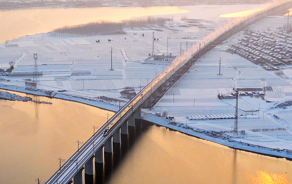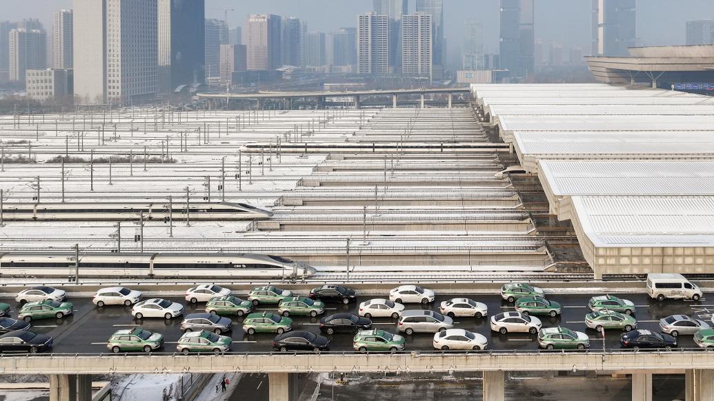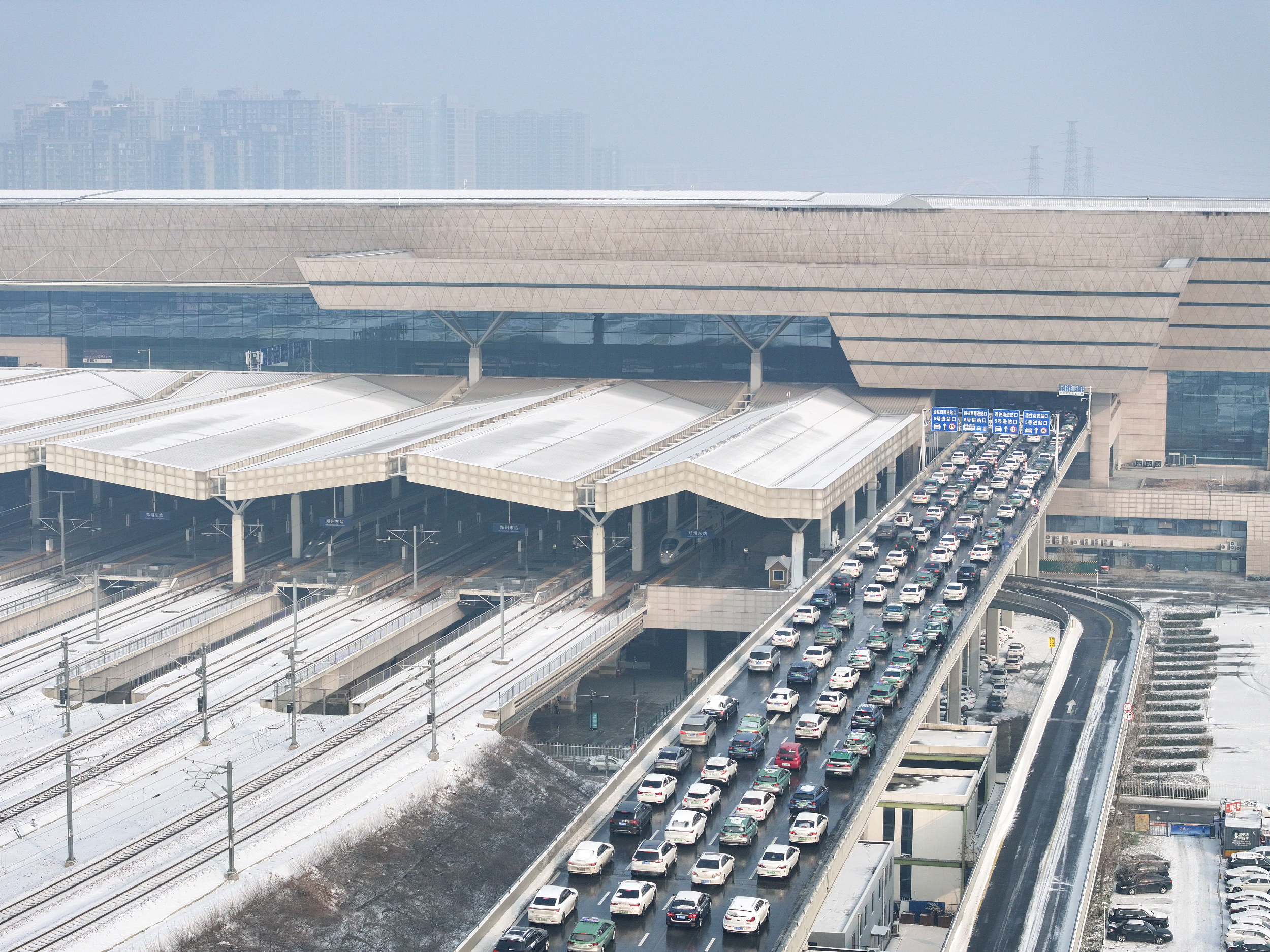 2024年2月5日,郑州东站拥堵的进站匝道。连日降雪后天空放晴,郑州东站异常繁忙,多列高铁同时进出车站,全力运送春运旅客。