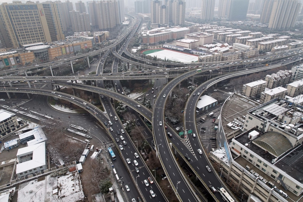 2024年2月5日,江苏南京,航拍一夜降雪后的赛虹桥立交和凤台路,道路上“落雪无痕”,早高峰的交通顺畅平稳。