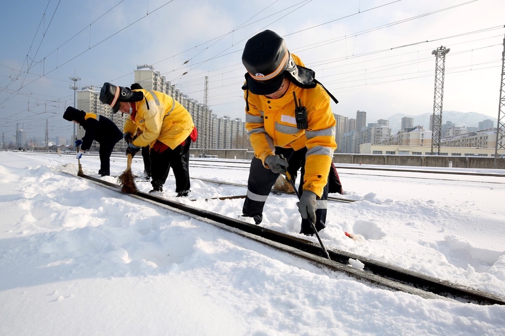 2024年2月5日,江苏省连云港市,在铁路连云港东站沿线,工人正在清扫道岔轨道上的冰雪。