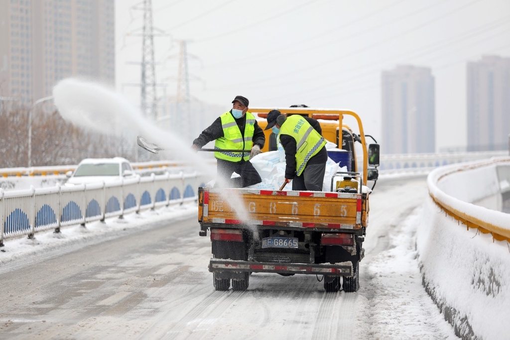 2024年2月5日,安徽省淮北市,市政抢修工人在高架进行抗凝除雪作业。
