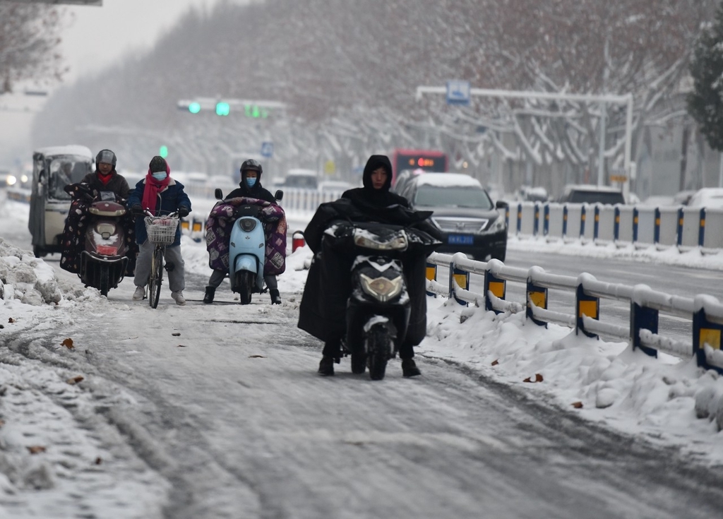 2024年2月5日,安徽阜阳,出行的市民在雪后道路上缓慢骑行。