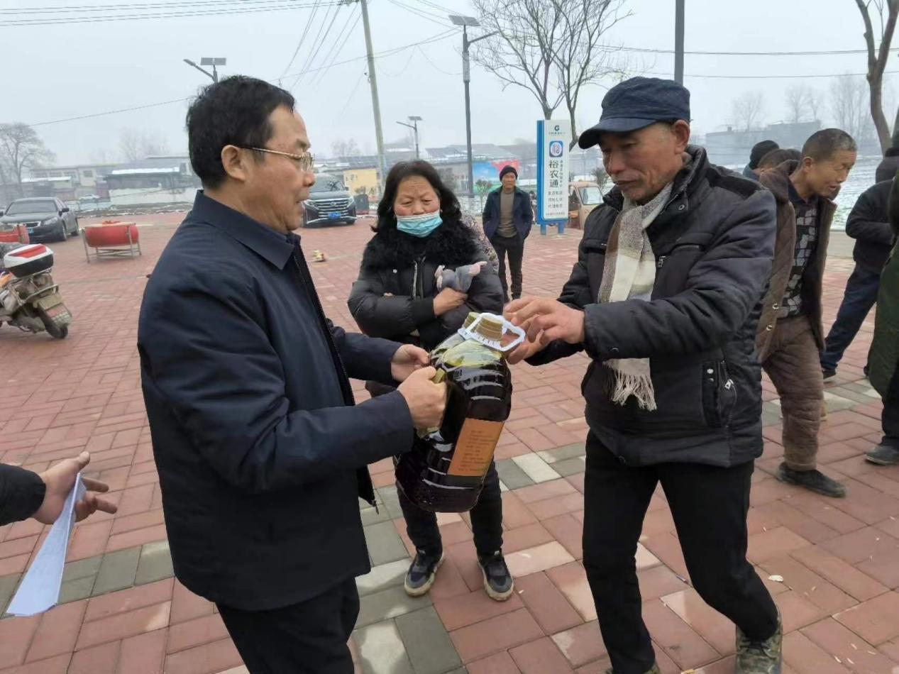 2月7日上午,平顶山学院联合郏县市场监管局在堂街镇圈李村举行“迎双节、送温暖、固成果、赠荣油”活动,为全村435户村民每户发放一桶优质5升装菜籽油,为大家送来龙年新春的祝福和温暖。