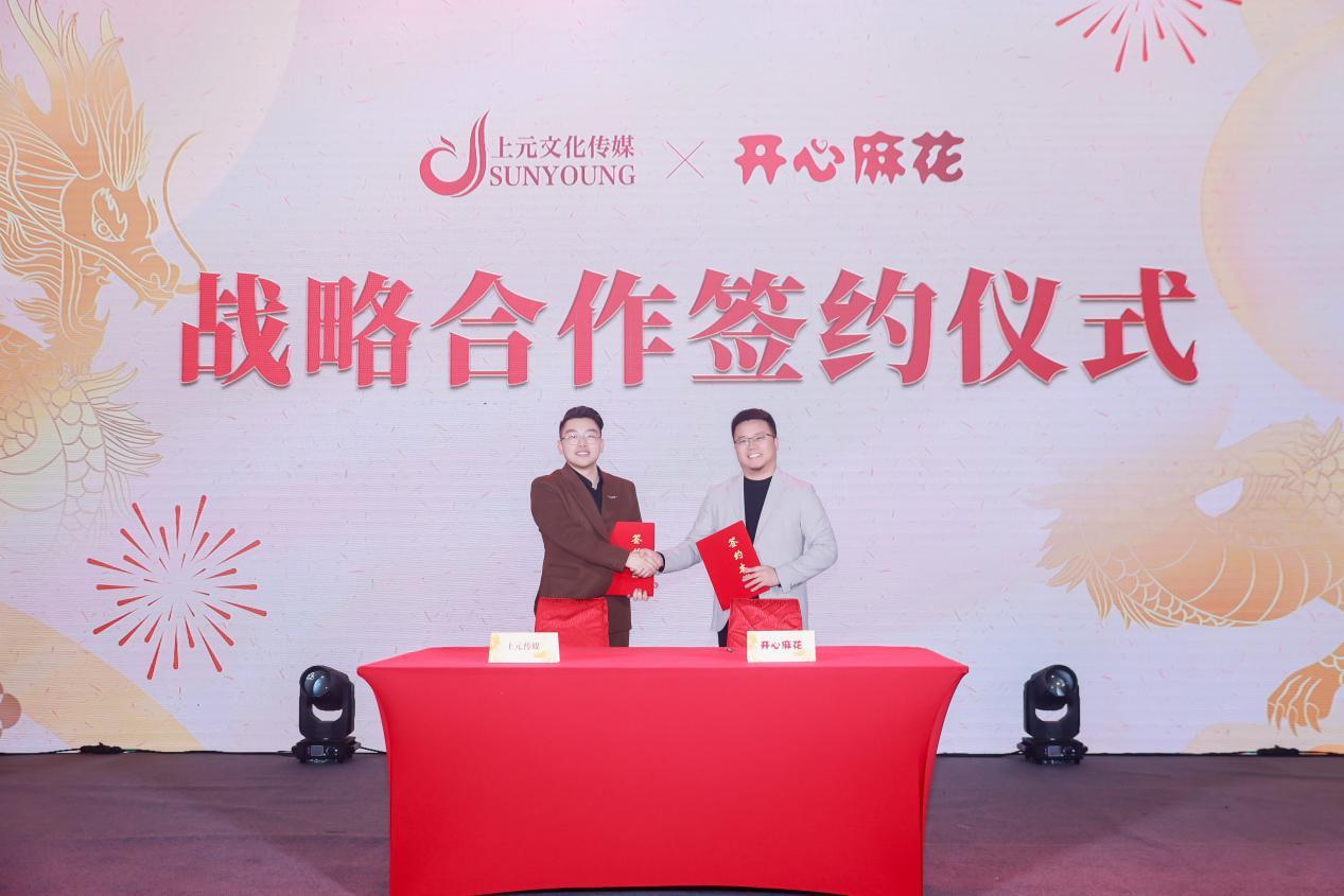2024年上元将深度联合开心麻花,为中国白酒品牌构筑多领域,多维度的强效联动,助力品牌实现破圈传播,实现策略、创意、媒介、传播复合型态的新型营销。年会现场,郑州上元文化传媒有限公司副总经理刘鑫与开心麻花河南区域副总经理张庆军隆重签约。
