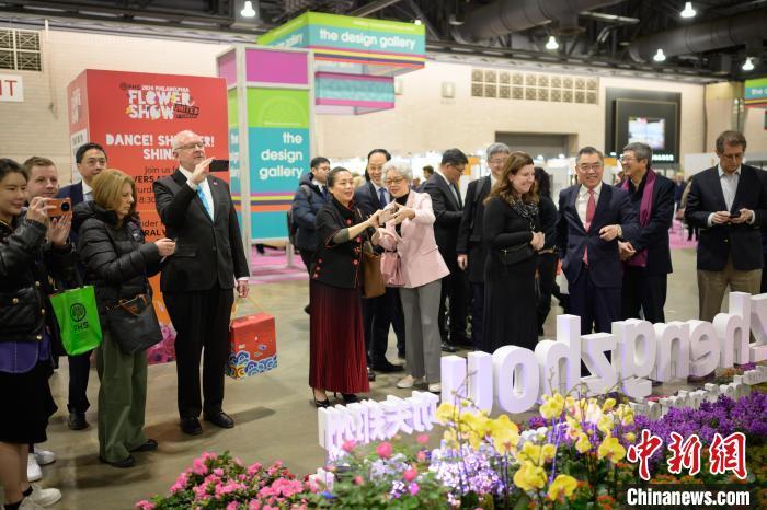 当地时间3月2日,一年一度的费城花展在美国宾夕法尼亚州费城开幕,以“功夫郑州——花俏嵩山”为主题的郑州展园当天在花展上亮相。图为中国驻纽约总领事黄屏(右三)带领嘉宾参观郑州展园。 Franck Zhou 摄