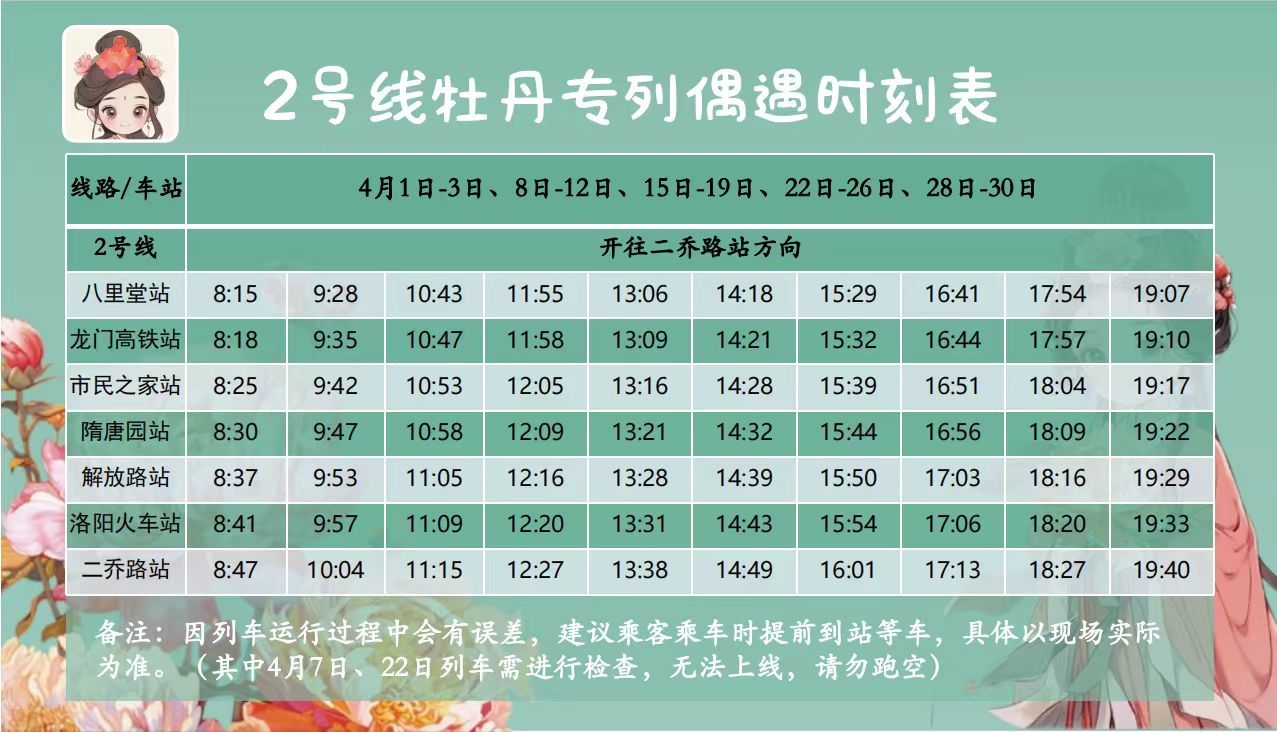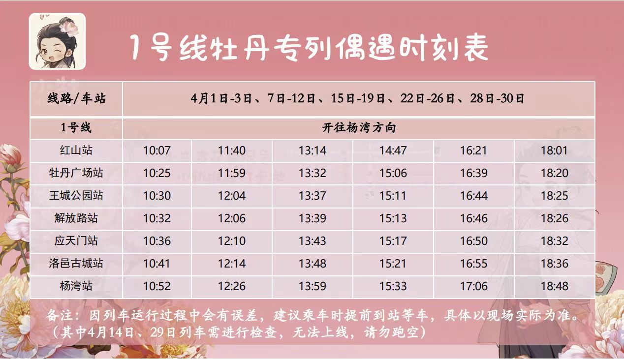 在洛阳市第41届牡丹文化节来临之际,为营造赏花氛围,助力游客赏花,3月28日起,洛阳地铁牡丹专列正式开始上线运营。想打卡的朋友,下面这个时刻表,赶紧收藏起来!
