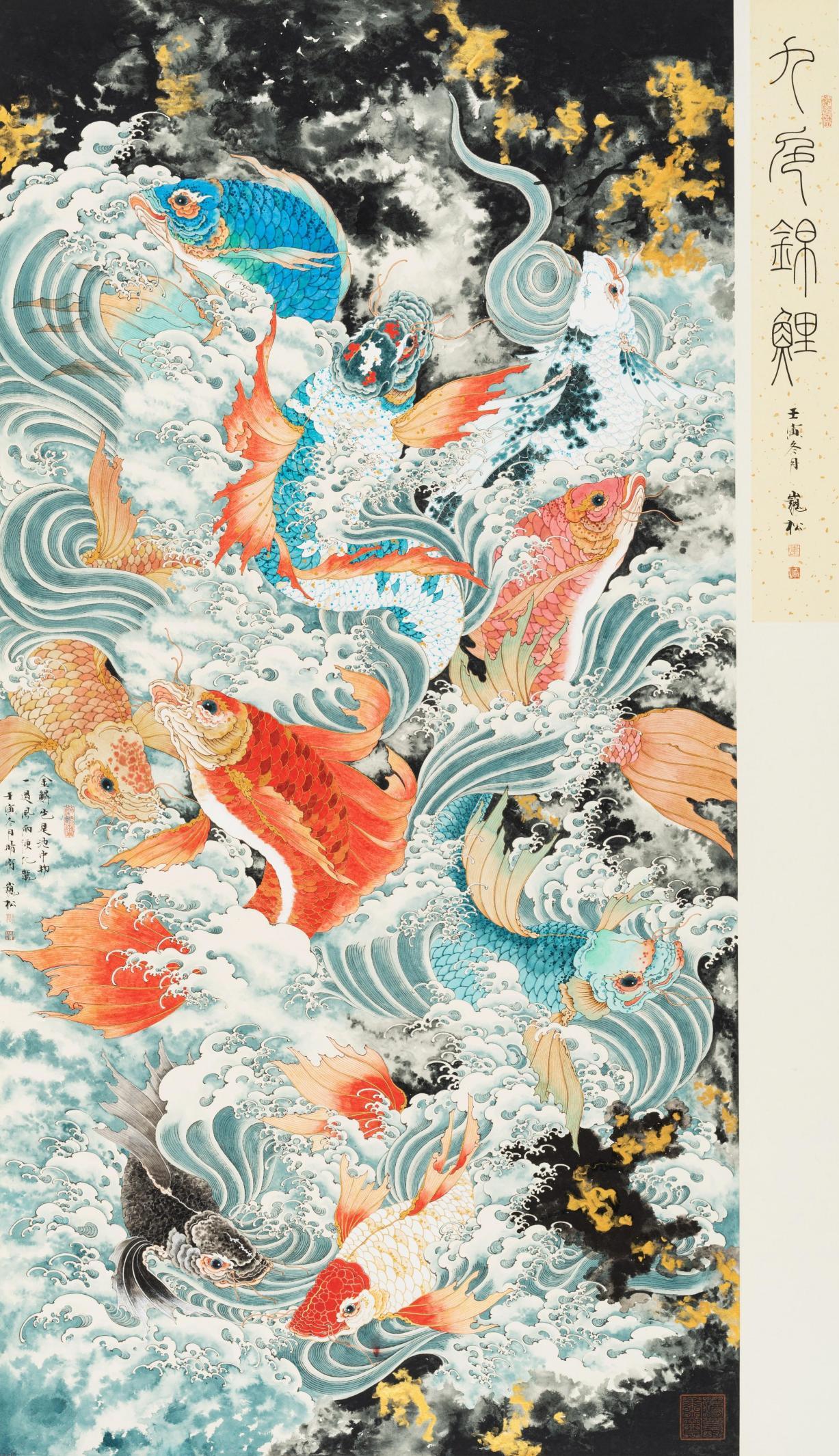 在李巍松老师所有的作品中,《九色锦鲤》被安排在了画展会场的中心位置。鲤鱼是中国传统的一个吉祥题材,这幅《九色锦鲤》是画家最近的大胆尝试,画面中九条锦鲤异态纷呈,浪花翻腾,墨色金色恣肆洇漫的渲染,呈现出富丽璀璨,玄秘幽邃的艺术效果,整个画面弥漫着强烈的个性和喷薄汹涌的创造力,这是他试图突破东方和西方,工笔和写意,古典和现代等种种束缚的一种艺术结果。是一种对立之美。这幅作品很有可能会是画家进一步探索创新的转折性作品。