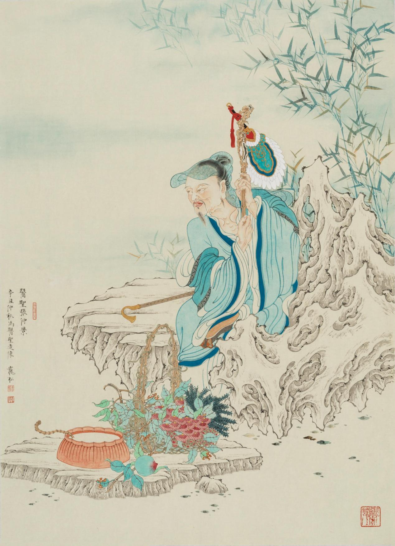 李巍松老师对于古代人物的描绘也极为擅长,《医圣张仲景》中医圣采药后于树下小憩,盘单膝依杖坐于石上,凝神遐思,神态安然,身边有药锄一把,脚下是满篮的药材,画面设色淡雅,人物造型生动。作者心仪前贤,学古思圣,若没有对古圣先贤有崇高的敬意,决不能有此精妙佳构。