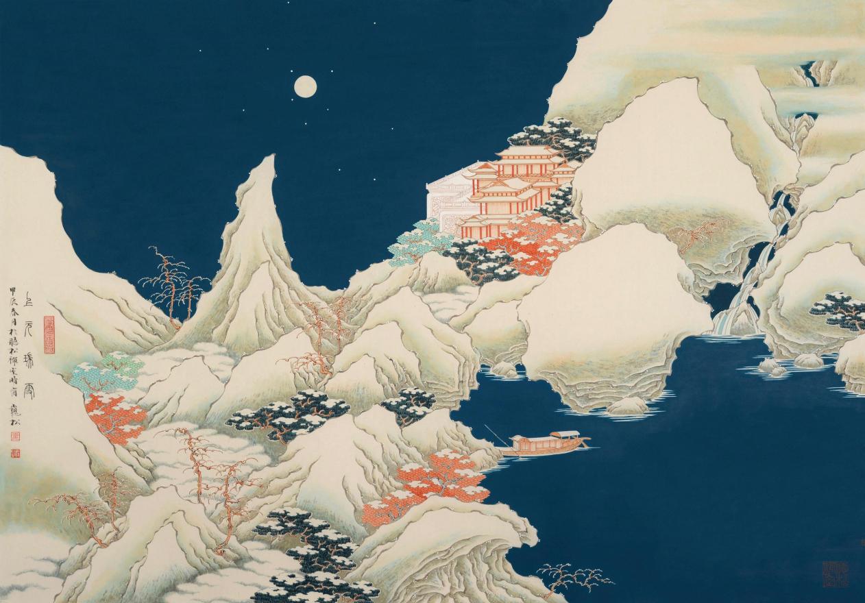 《上元瑞雪》这幅作品有两个特别之处是有别前人的,一是以大块“梵青”铺染夜空和湖水,另一个就是对角构图,画面中用宋人界画技法严谨绘制精工楼阁和舟楫,山林杂树的刻画亦是一丝不苟,再以留白法染出雪峰和烟岚,进而用大量“梵青”对底色进行反复厚重的渲染。画面中“梵青”沉郁深邃,雪月寂静皎洁,对画禅坐,遐思驰神,如入道境,如踏玄冥,使观者顿觉胸中澄澈,心内空明,所谓“澄怀观道”,观此图应有所悟。