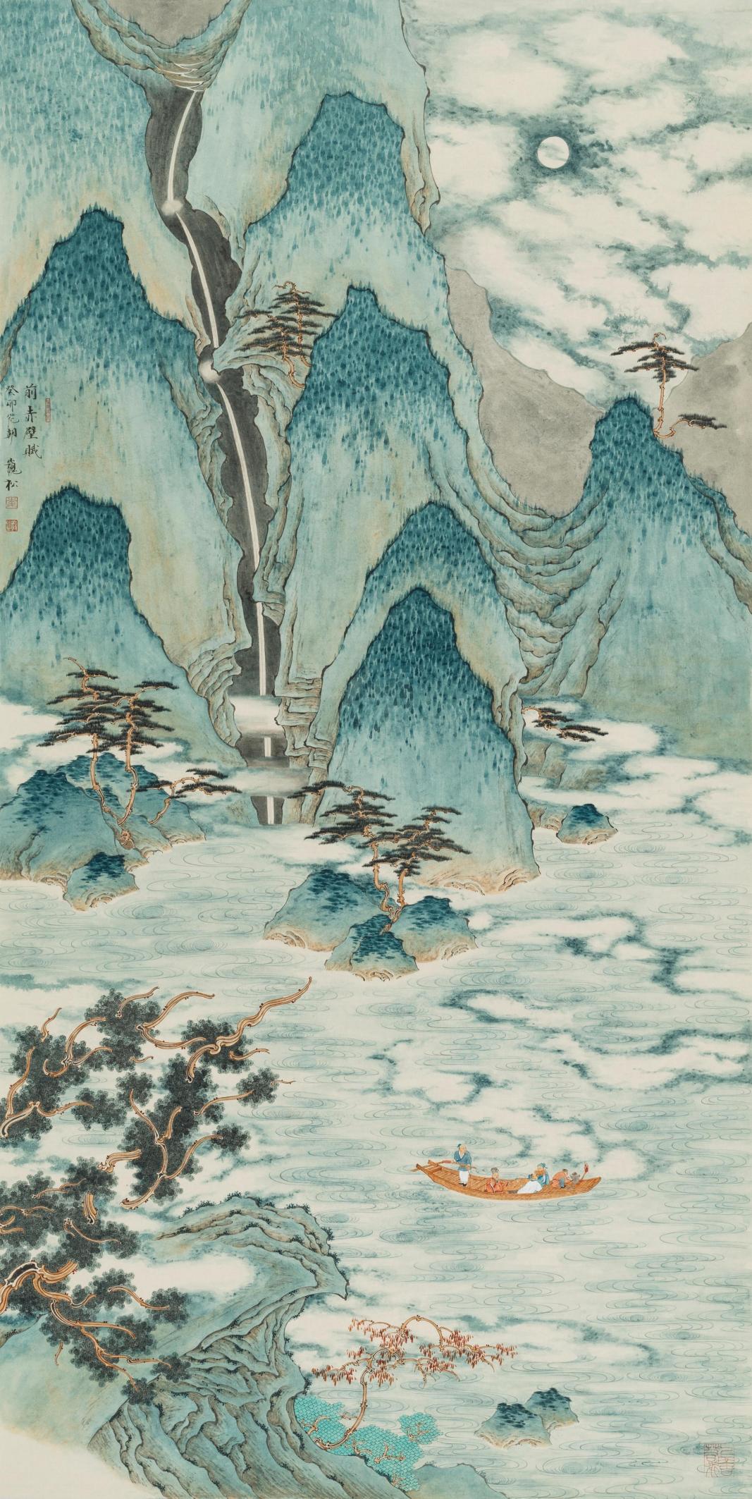 《满船清梦压星河》就是画家以“梵青”风格进行独特尝试的作品,该作品题材灵感来源于画家极为喜爱的一首诗,元代唐珙的《题龙阳县青草湖》。画中明月高悬,映照在波光粼粼的湖面,一叶小舟泊于湖上,微风吹来,满湖粼光若群星泄地,如梦如幻似真非真,此中有真意,当得一个妙字。