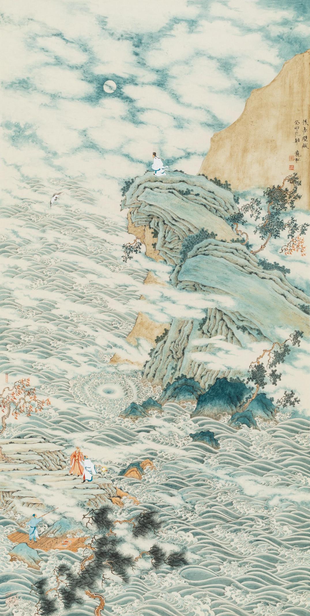 如果说东坡居士的前赤壁赋描写的是相对静逸的场景,而后赤壁赋即是较为动态的景象,后赤壁赋最精彩的一段为“乃摄衣而上,履巉岩,披蒙茸,距虎豹,蹬虬龙”……划然长啸,草木震动,山鸣谷应,风起水涌”。 画家选择了这段最有表达难度的段落,创作了《后赤壁赋》。在描绘这一场景时候,对苏子、友人、舟子等人物的造型和位置,画面构图、色调,气势的营造,以及山石、树木、烟岚等物象的表现手法都作了精心设计,更是运用拿手的“海水江崖”水法对汹涌澎湃的江水进行了入微刻画,从他的水法上可以看到画家娴熟的笔法,深厚的功力,此精湛技艺真可谓是如擎仙笔,鬼手通玄,画面风劲浪涌,泣鬼惊神。东坡居士如得见此图,能忆得元丰五年十月之望否。