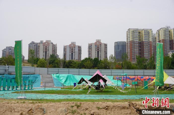 郑州商都书院街墓地遗址外围草坪撑起天幕、摆上露营桌椅供市民休闲。韩章云 摄