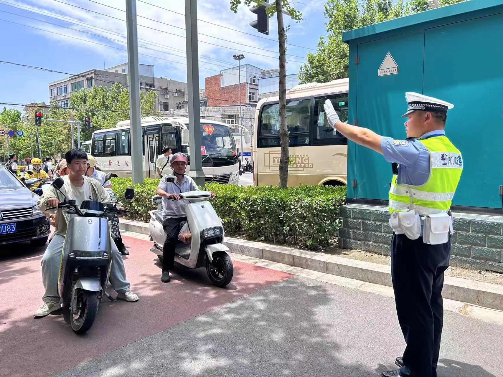 中招考试第一天,郑州交警五支队、十一支队民警提前一个半小时上岗,对辖区各考点周边乱停放的电动车和机动车进行清理拖移,铁骑民警加强各考点周边巡逻频次和密度。交警三支队在各考点周边设置临时停车泊位,满足送考家长停车需求。登封交警在易堵路段、事故多发点段加派警力巡逻值守,为考生创造安全畅通的交通环境。