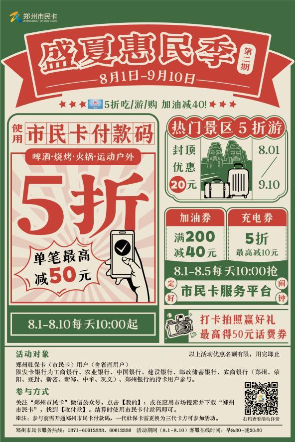 8月1日上午10点起,符合条件的用户在“郑州市民卡APP”或“郑州市民卡”微信公众号使用市民卡付款码在线下指定啤酒、烧烤、火锅、运动品牌等场景门店消费有机会享5折(单笔封顶减50元)优惠,活动截至8月10日;