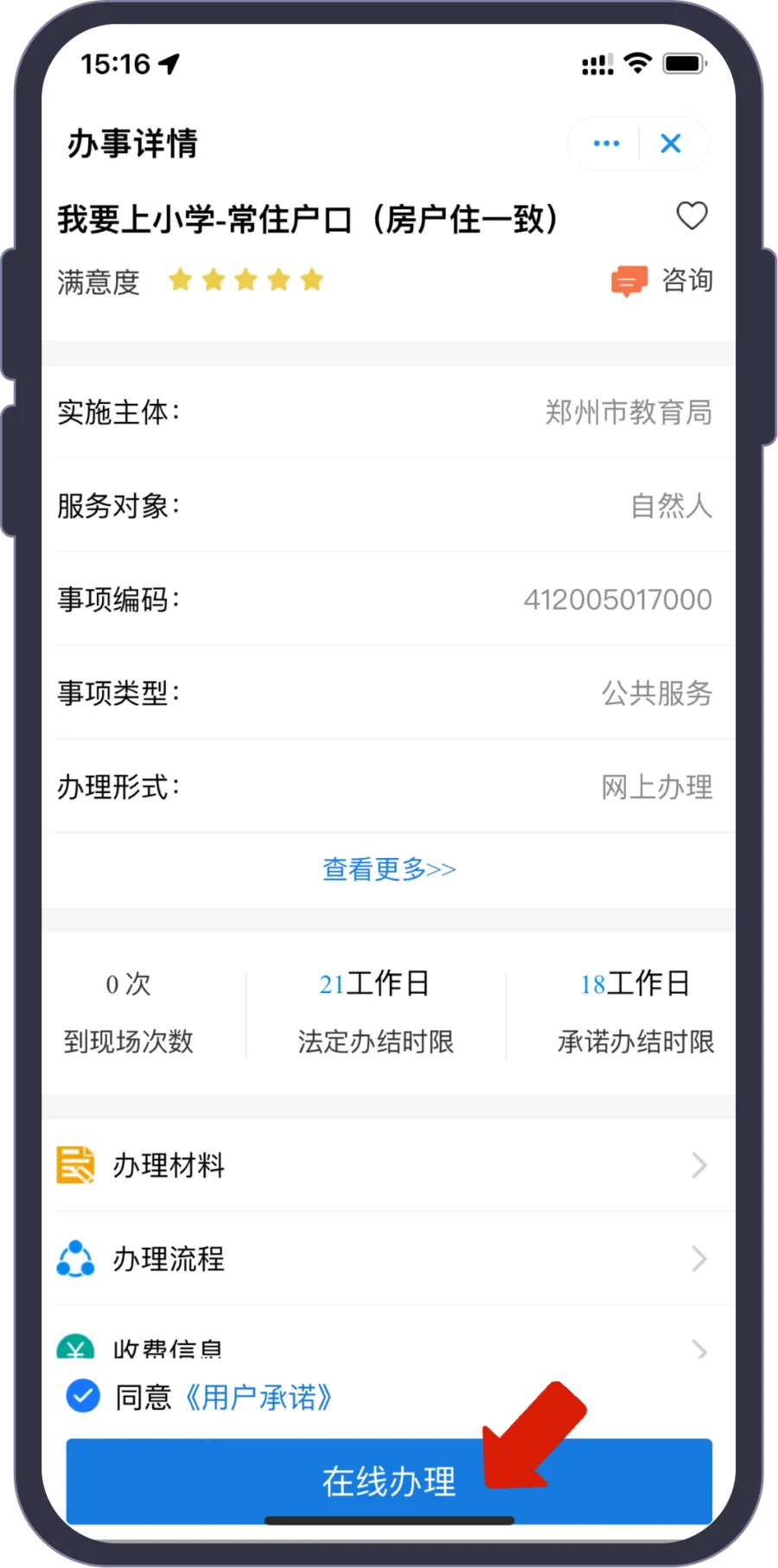 ②点击选择“我要上小学-常住户口(房户住一致)”,仔细阅读后,勾选“已阅读并同意上述条款内容”,然后点击“确认”,进入办事详情页;