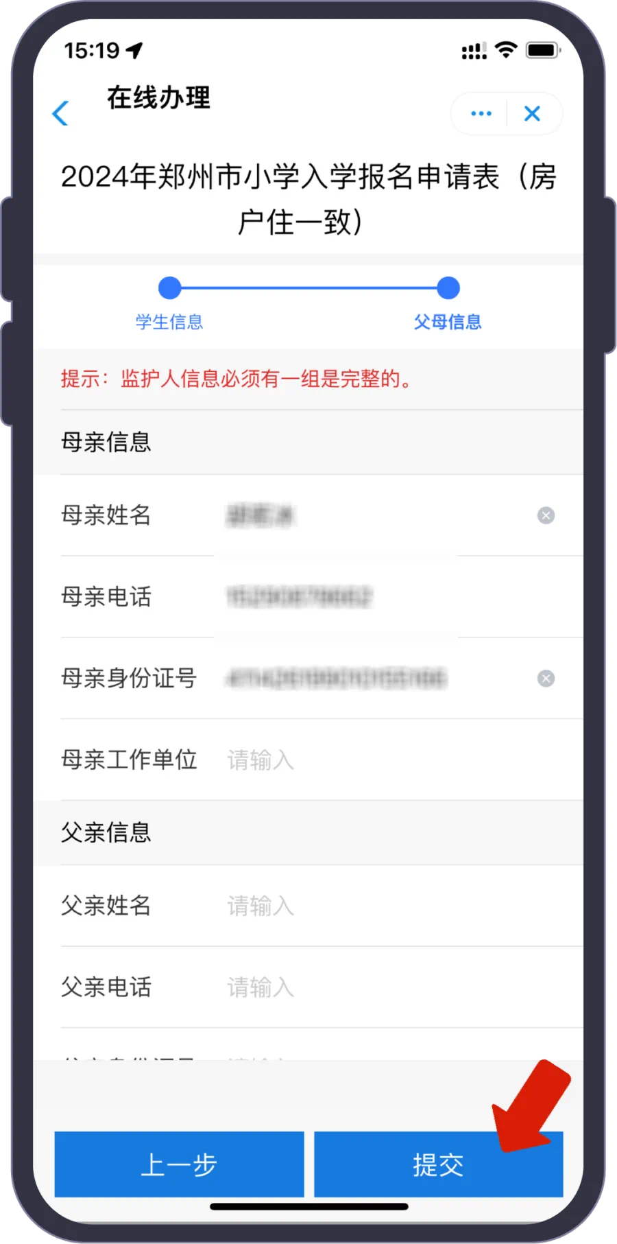 ⑦填写父母信息,要求父母信息至少有一组是完整的。完成后可点击“提交”按钮。若满足申报条件,提交成功;