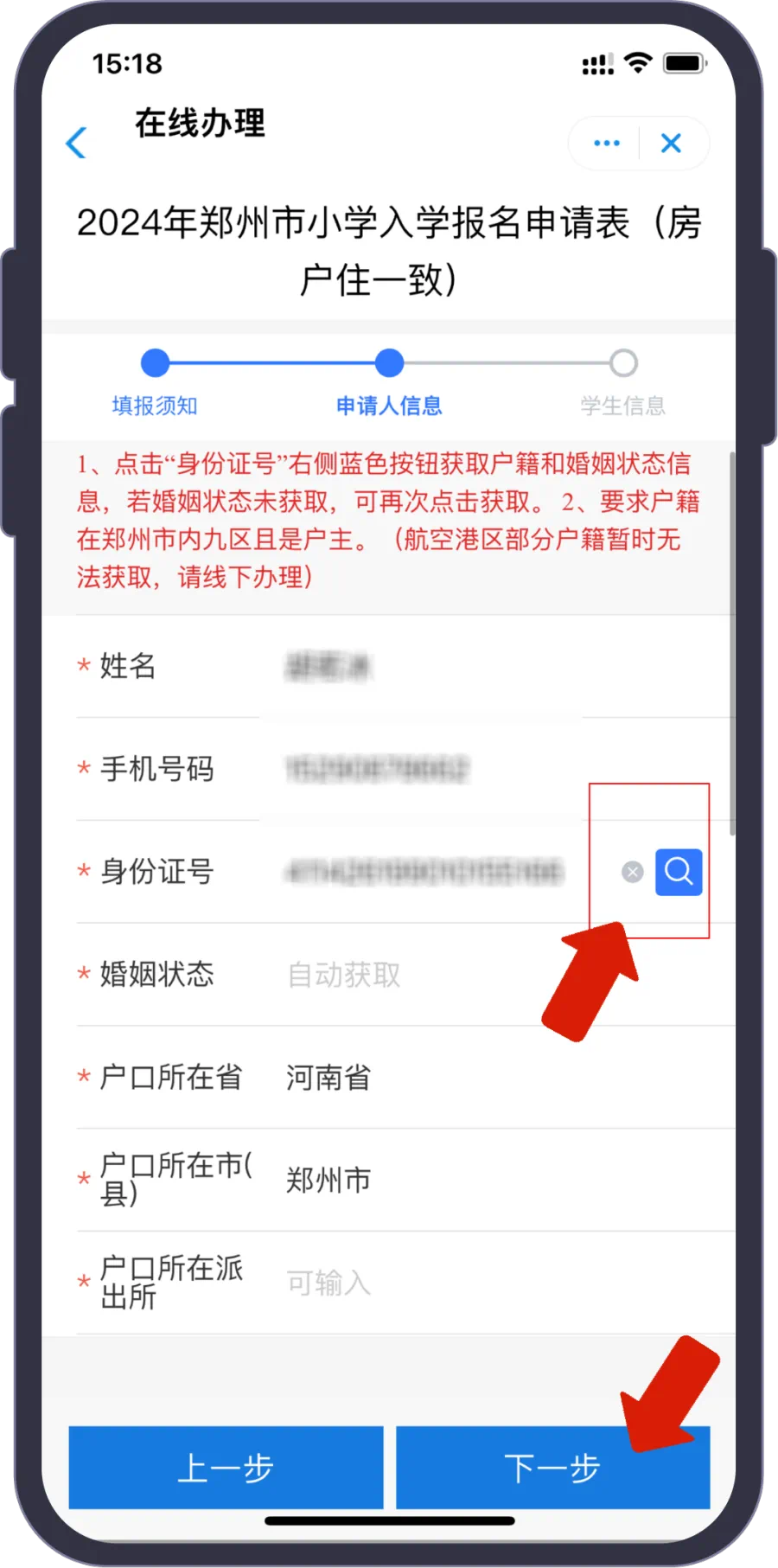 ⑤请根据页面中的红色文字提示,完成身份信息及房产信息。点击“下一步”;