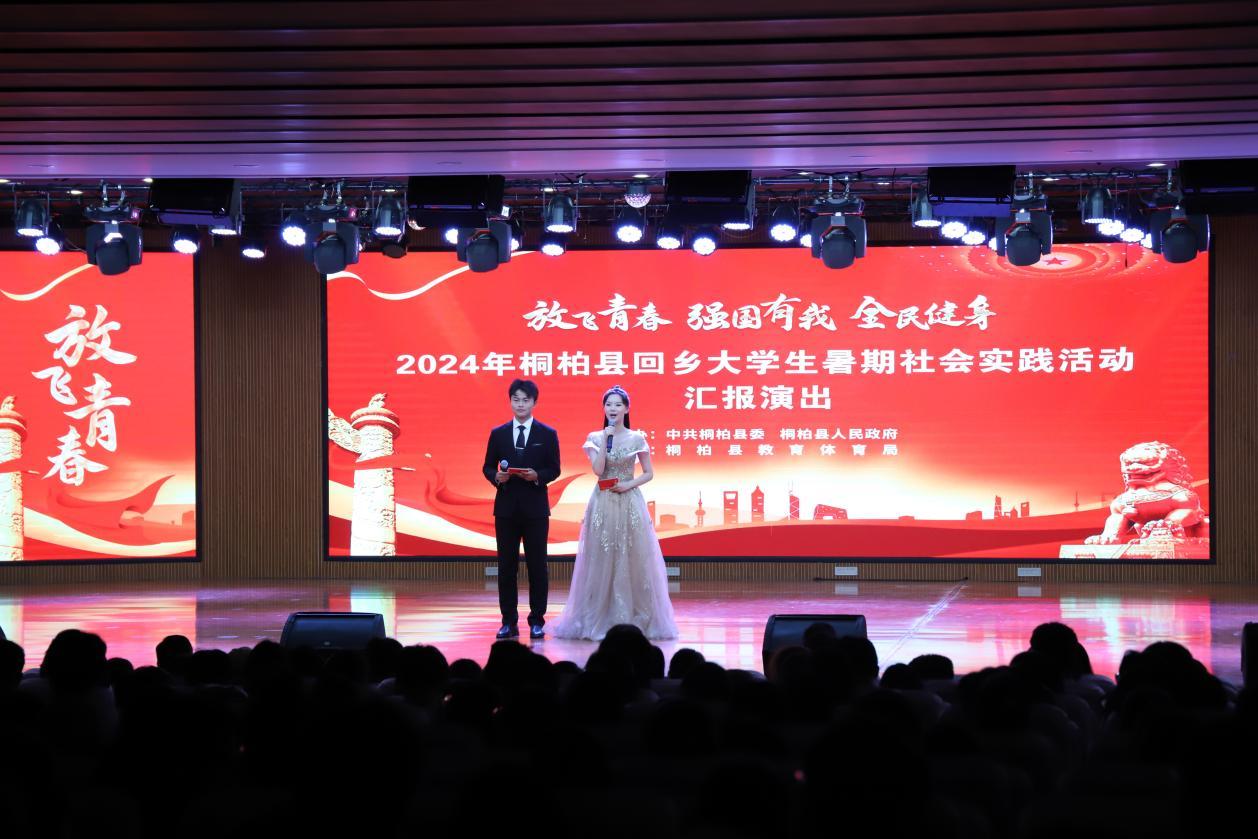 8月7日,桐柏县回乡大学生暑期社会实践活动汇报演出在盘古学校举行。县委书记党建凯,县委副书记、县政府县长许晓燕,县委副书记杨好宁,县委常委、组织部长李刚,县委常委、宣传部部长,县政府副县长迟赵冰,县委常委、县委办主任高申茂,县政协副主席李古阳出席活动,参与社会实践的近700名返乡大学生参加活动。