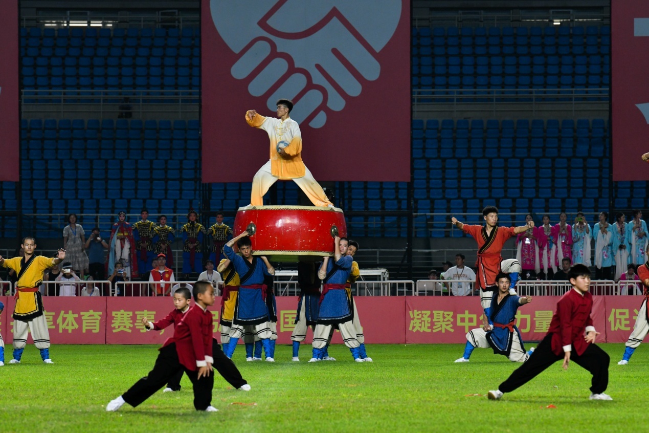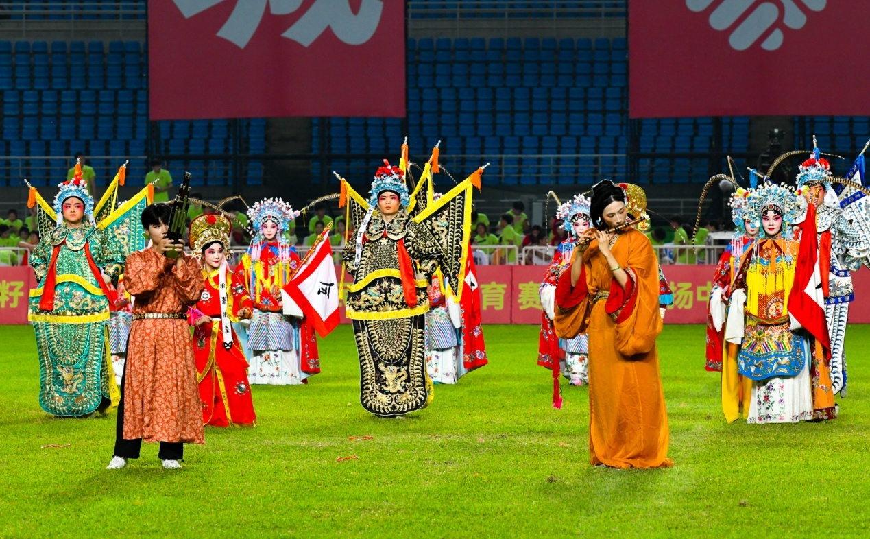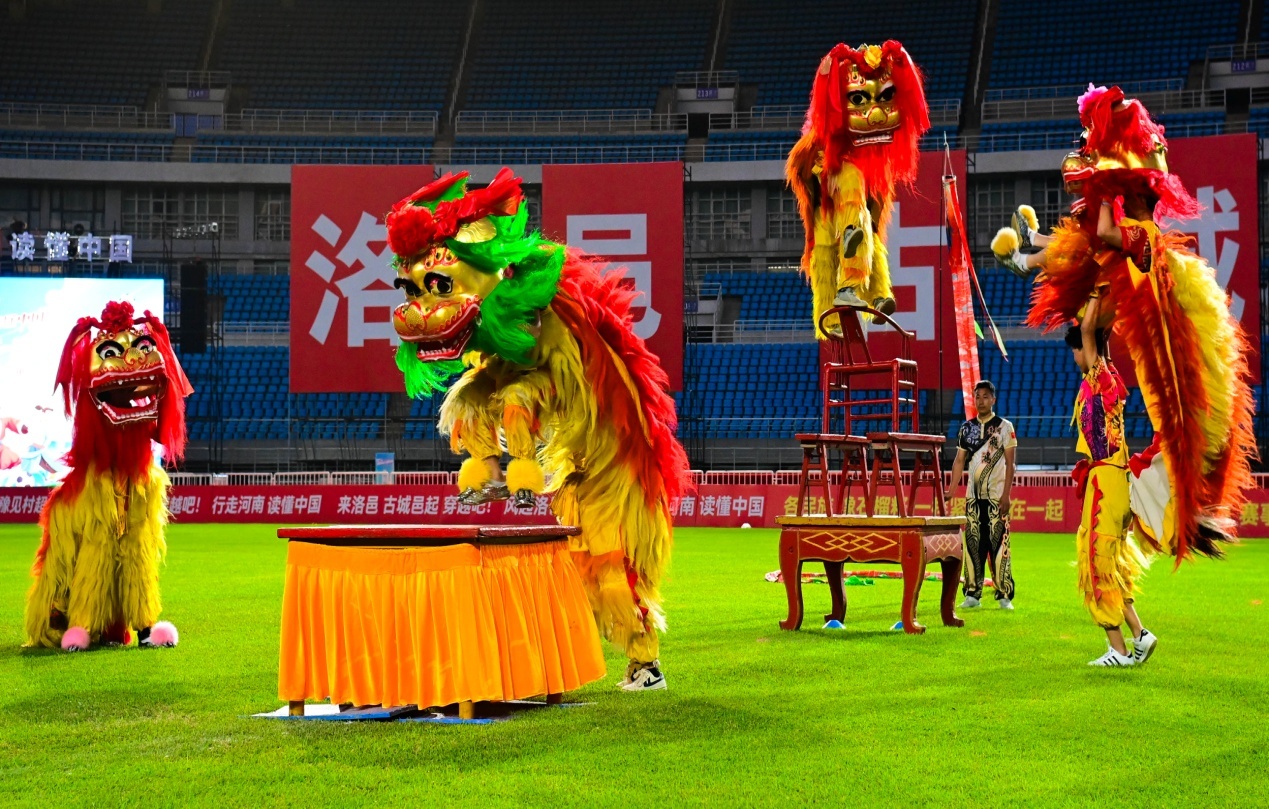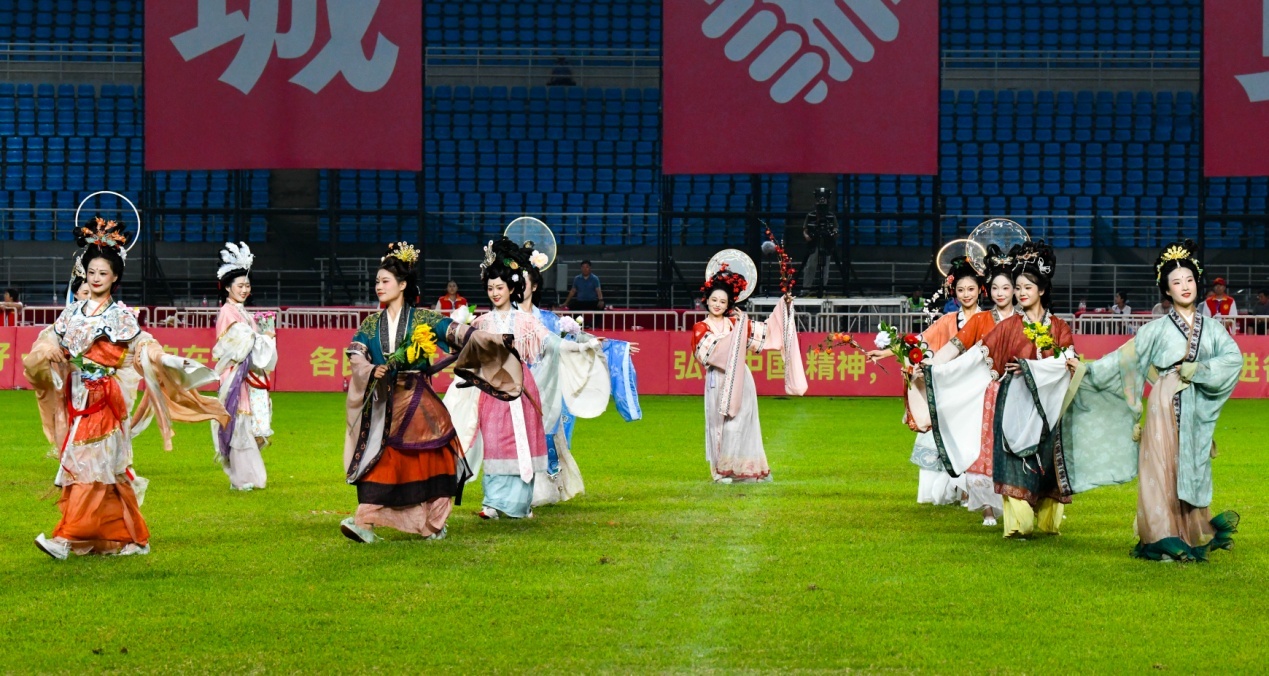 参赛球队及节目展演人员以方阵形式依次入场。贵州村超方阵包括侗族大歌方阵、苗族芦笙舞方阵、贵州村超足球队方阵;洛邑古城方队包括汉服复原秀与十二花神方阵、寻迹洛神赋方阵、少林功夫足球方阵、安阳妇好+甲骨文方阵、国潮新唱方阵、省级非遗项目嵩县旧县背装方阵、洛邑古城足球队员方队。独具地域特色的出场方式展示民族文化魅力,现场响起阵阵热烈掌声。
