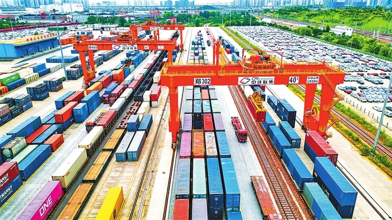 9月6日,中铁联集郑州中心站一片繁忙,进出口货物装卸作业24小时不停歇。目前,中欧班列(郑州)已构建起“27个境外直达站点、9个出入境口岸”的国际多式联运集疏运网络,业务网络遍布40多个国家140多个城市。今年上半年,中铁联集郑州中心站承运的出口货值达到150亿元,相比去年同期增长约20%。(记者 聂冬晗 摄)