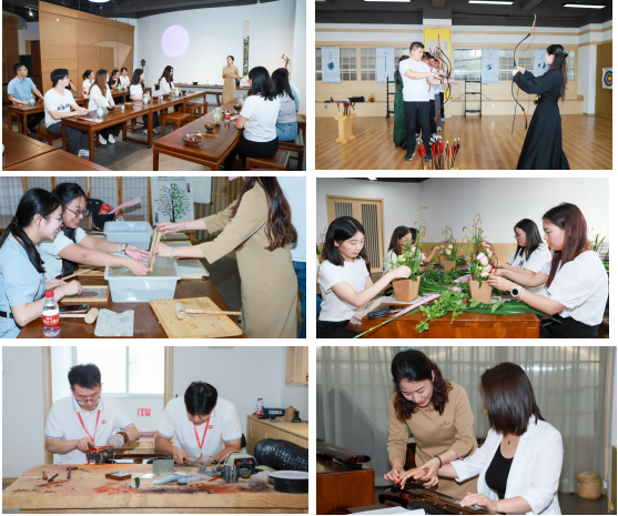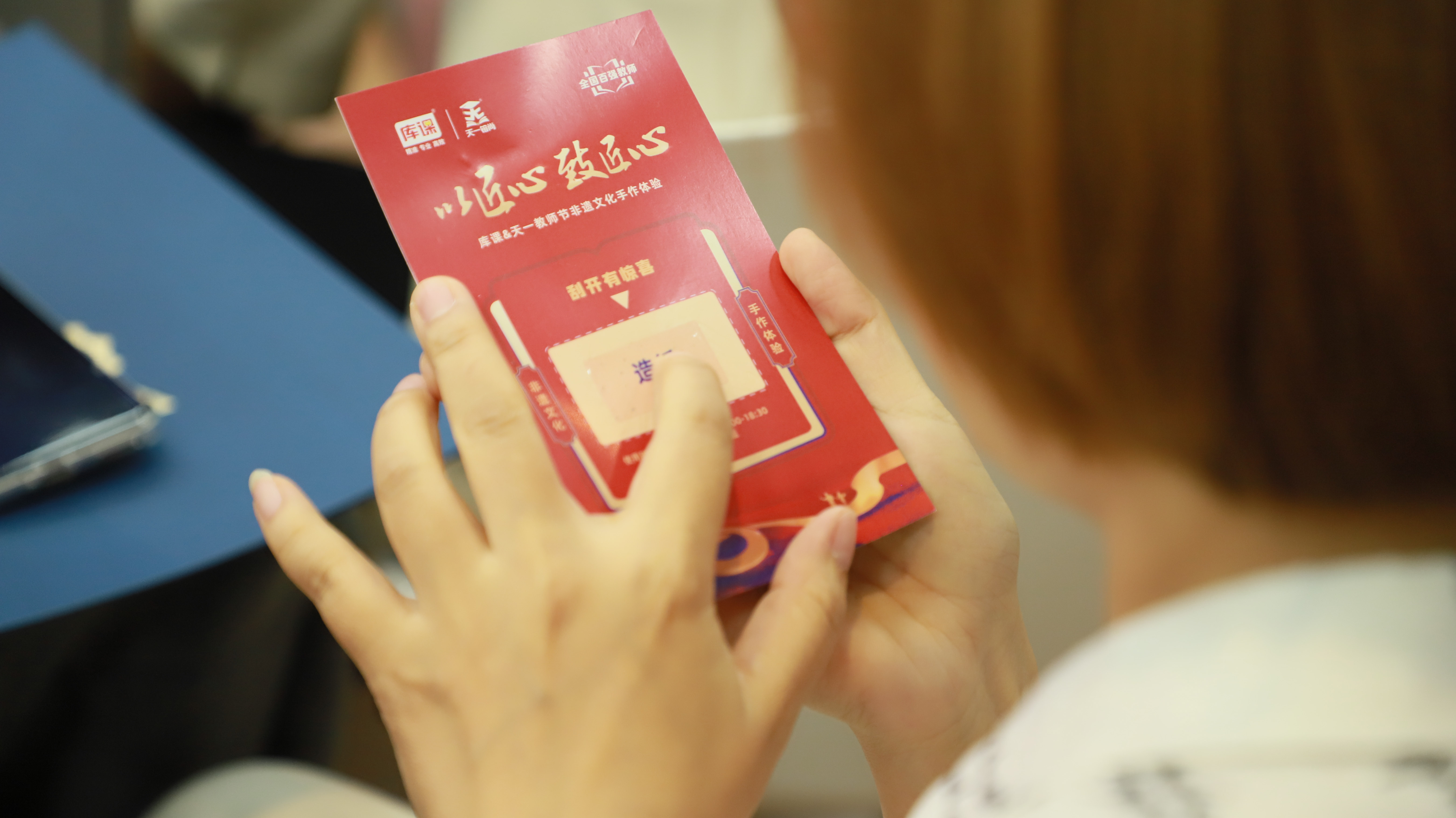 今年,库课、天一的教师节活动基调更为轻松。颁奖结束后,主持人带领大家刮开了一张特殊的卡片,每张卡片都隐藏了一个非遗项目,10项非遗体验与200个盲盒刮刮卡的“碰撞”,让参会老师们在“拼手气”的愉快氛围中,体验水拓、点茶、古琴 、木工、扎染、造纸、国画、礼射、香事、中式插花等非遗手作,沉浸式地感受“以匠心致匠心”的精神共鸣。