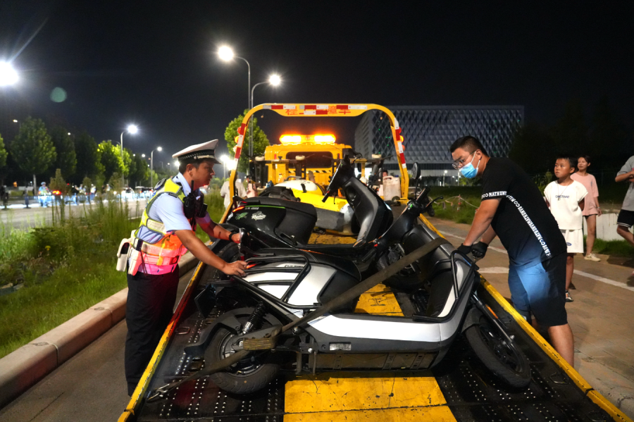 8月16日晚,郑州公安交管部门组织400名警力,封闭奥体中心区域部分路口,对“飙车炸街”交通违法行为开展严查行动。当晚共查处各类交通违法人员33人,暂扣电动车等各类车辆31辆。