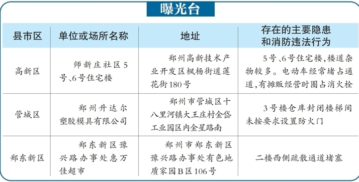 这次曝光的单位分别是高新区师新庄社区、管城回族区郑州升达尔塑胶模具有限公司和郑东新区豫兴路办事处惠万佳超市,隐患问题包括电动自行车经常堵占消防通道、楼梯间未按要求设置防火门、疏散通道堵塞等。